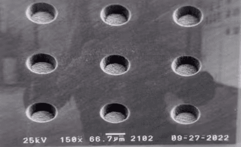 The system integrates a high-speed scanning galvanometer with an adjustable beam expansion module, supporting multiple spot modes such as Gaussian and flat-top. It is suitable for microhole processing on various substrates including PI, BT, ABF, RCC, PTFE, PEEK, and ceramics, achieving high-precision blind holes and through holes with a diameter in the range of 15μm.